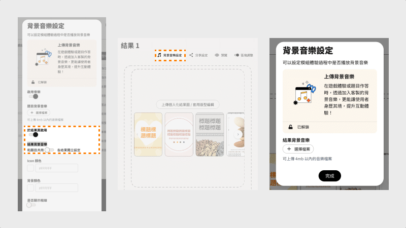 如果開啟了「於結果頁面」啟用,可以再設定「結果背景音樂」的形式,你可以讓結果頁與「和題目共用」同一首歌,或讓「各結果獨立設定」設定不同的音樂。
